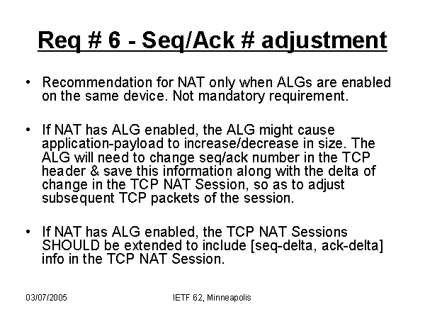 Req # 6 - Seq/Ack # adjustment Recommendation for NAT only when ALGs are enabled on the same device. Not mandatory requirement. If NAT has ALG enabled, the ALG might cause application-payload to increase/decrease in size. The ALG will need to change seq/ack number in the TCP header & save this information along with the delta of change in the TCP NAT Session, so as to adjust subsequent TCP packets of the session. If NAT has ALG enabled, the TCP NAT Sessions SHOULD be extended to include [seq-delta, ack-delta] info in the TCP NAT Session. |