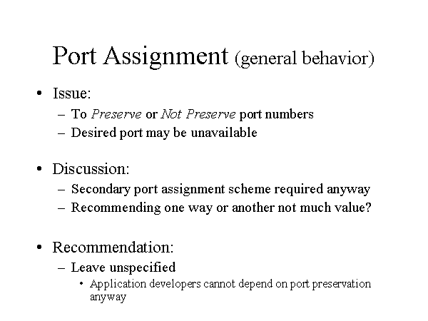 Port Assignment (general behavior) Issue: To Preserve or Not Preserve port numbers Desired port may be unavailable Discussion: Secondary port assignment scheme required anyway Recommending one way or another not much value? Recommendation: Leave unspecified Application developers cannot depend on port preservation anyway |