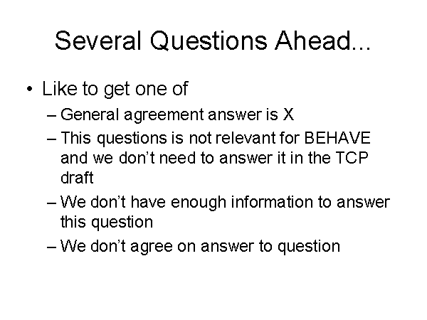 Several Questions Ahead... Like to get one of General agreement answer is X This questions is not relevant for BEHAVE and we don’t need to answer it in the TCP draft We don’t have enough information to answer this question We don’t agree on answer to question |
