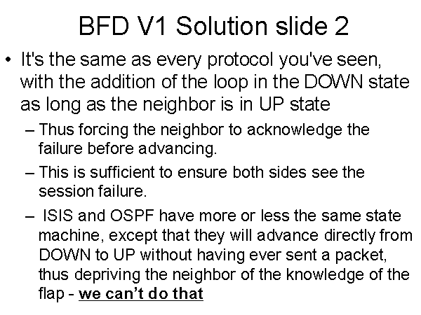 BFD V1 Solution slide 2 It's the same as every protocol you've seen, with the addition of the loop in the DOWN state as long as the neighbor is in UP state Thus forcing the neighbor to acknowledge the failure before advancing. This is sufficient to ensure both sides see the session failure. ISIS and OSPF have more or less the same state machine, except that they will advance directly from DOWN to UP without having ever sent a packet, thus depriving the neighbor of the knowledge of the flap - we can’t do that |
