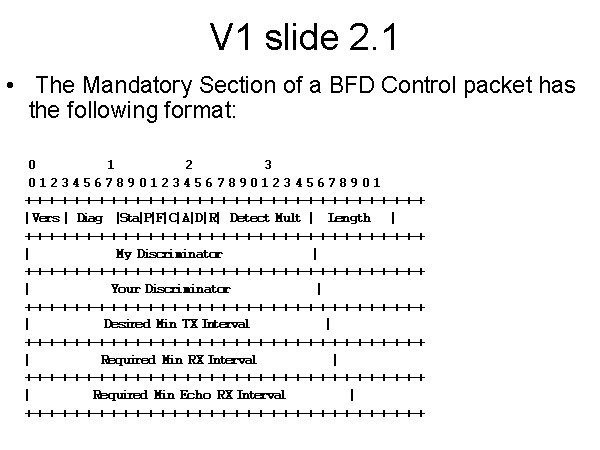V1 slide 2.1 The Mandatory Section of a BFD Control packet has the following format: 0 1 2 3 0 1 2 3 4 5 6 7 8 9 0 1 2 3 4 5 6 7 8 9 0 1 2 3 4 5 6 7 8 9 0 1 +-+-+-+-+-+-+-+-+-+-+-+-+-+-+-+-+-+-+-+-+-+-+-+-+-+-+-+-+-+-+-+-+ | Vers | Diag |Sta|P|F|C|A|D|R| Detect Mult | Length | +-+-+-+-+-+-+-+-+-+-+-+-+-+-+-+-+-+-+-+-+-+-+-+-+-+-+-+-+-+-+-+-+ | My Discriminator | +-+-+-+-+-+-+-+-+-+-+-+-+-+-+-+-+-+-+-+-+-+-+-+-+-+-+-+-+-+-+-+-+ | Your Discriminator | +-+-+-+-+-+-+-+-+-+-+-+-+-+-+-+-+-+-+-+-+-+-+-+-+-+-+-+-+-+-+-+-+ | Desired Min TX Interval | +-+-+-+-+-+-+-+-+-+-+-+-+-+-+-+-+-+-+-+-+-+-+-+-+-+-+-+-+-+-+-+-+ | Required Min RX Interval | +-+-+-+-+-+-+-+-+-+-+-+-+-+-+-+-+-+-+-+-+-+-+-+-+-+-+-+-+-+-+-+-+ | Required Min Echo RX Interval | +-+-+-+-+-+-+-+-+-+-+-+-+-+-+-+-+-+-+-+-+-+-+-+-+-+-+-+-+-+-+-+-+ |