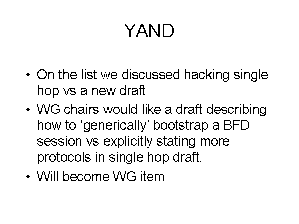WG chairs would like a draft describing how to ‘generically’ bootstrap a BFD session vs explicitly stating more protocols in single hop draft.