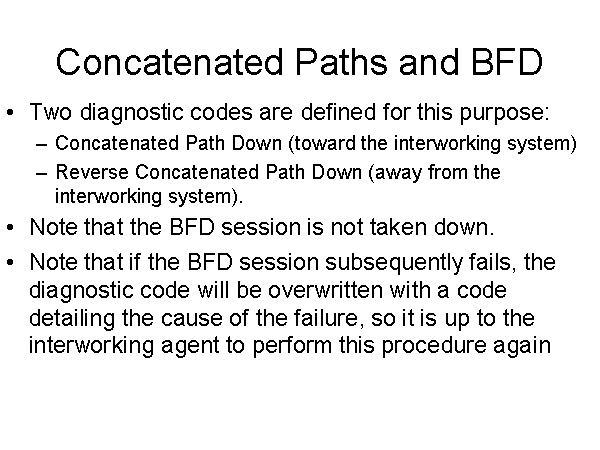 Concatenated Paths and BFD Two diagnostic codes are defined for this purpose: Concatenated Path Down (toward the interworking system) Reverse Concatenated Path Down (away from the interworking system). Note that the BFD session is not taken down. Note that if the BFD session subsequently fails, the diagnostic code will be overwritten with a code detailing the cause of the failure, so it is up to the interworking agent to perform this procedure again |