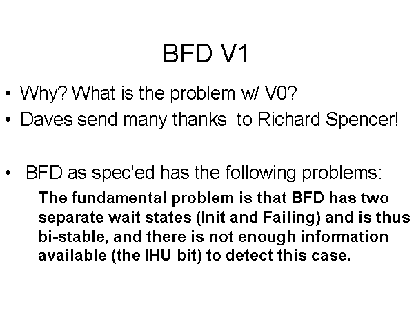 BFD V1 Why? What is the problem w/ V0? Daves send many thanks to Richard Spencer! BFD as spec'ed has the following problems: The fundamental problem is that BFD has two separate wait states (Init and Failing) and is thus bi-stable, and there is not enough information available (the IHU bit) to detect this case. |
