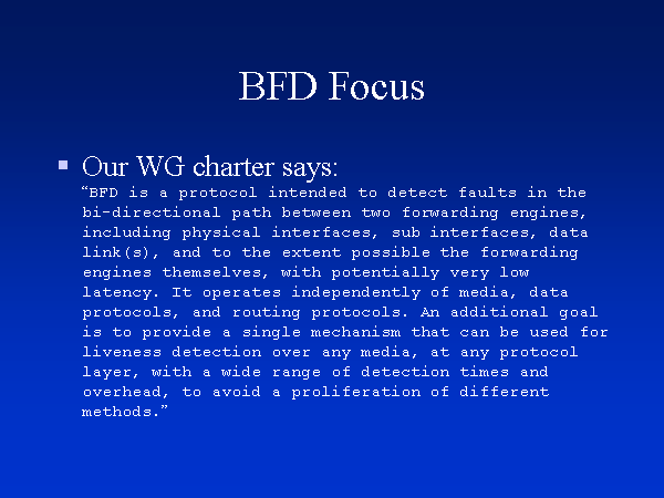 BFD Focus Our WG charter says:“BFD is a protocol intended to detect faults in the bi-directional path between two forwarding engines, including physical interfaces, sub interfaces, data link(s), and to the extent possible the forwarding engines themselves, with potentially very low latency. It operates independently of media, data protocols, and routing protocols. An additional goal is to provide a single mechanism that can be used forliveness detection over any media, at any protocol layer, with a wide range of detection times and overhead, to avoid a proliferation of different methods.” |
