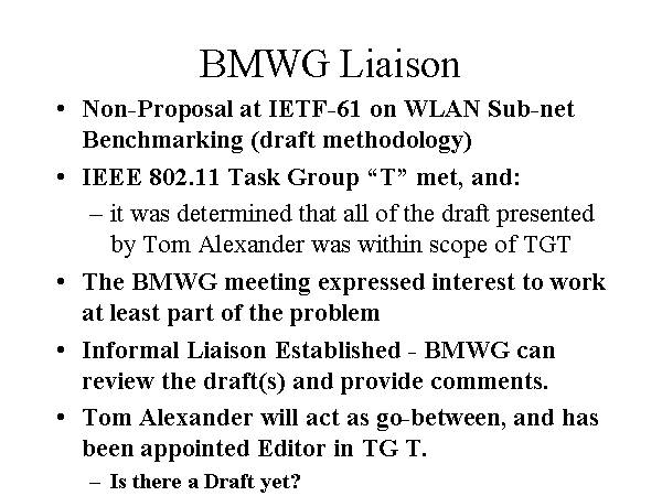 BMWG Liaison Non-Proposal at IETF-61 on WLAN Sub-net Benchmarking (draft methodology) IEEE 802.11 Task Group “T” met, and: it was determined that all of the draft presented by Tom Alexander was within scope of TGT The BMWG meeting expressed interest to work at least part of the problem Informal Liaison Established - BMWG can review the draft(s) and provide comments. Tom Alexander will act as go-between, and has been appointed Editor in TG T. Is there a Draft yet? |