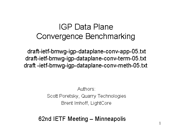 IGP Data Plane Convergence Benchmarking draft-ietf-bmwg-igp-dataplane-conv-app-05.txt draft-ietf-bmwg-igp-dataplane-conv-term-05.txt draft -ietf-bmwg-igp-dataplane-conv-meth-05.txt Authors: Scott Poretsky, Quarry Technologies Brent Imhoff, LightCore 62nd IETF Meeting – Minneapolis |