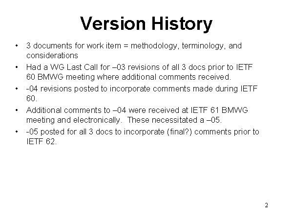 Version History 3 documents for work item = methodology, terminology, and considerations Had a WG Last Call for –03 revisions of all 3 docs prior to IETF 60 BMWG meeting where additional comments received. -04 revisions posted to incorporate comments made during IETF 60. Additional comments to –04 were received at IETF 61 BMWG meeting and electronically. These necessitated a –05. -05 posted for all 3 docs to incorporate (final?) comments prior to IETF 62. |