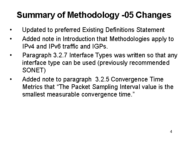 Summary of Methodology -05 Changes Updated to preferred Existing Definitions Statement Added note in Introduction that Methodologies apply to IPv4 and IPv6 traffic and IGPs. Paragraph 3.2.7 Interface Types was written so that any interface type can be used (previously recommended SONET) Added note to paragraph 3.2.5 Convergence Time Metrics that “The Packet Sampling Interval value is the smallest measurable convergence time.” |