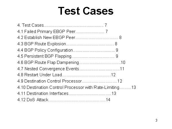 Test Cases 4. Test Cases.................................................. 7 4.1 Failed Primary EBGP Peer........................ 7 4.2 Establish New EBGP Peer.................................... 8 4.3 BGP Route Explosion........................................ 8 4.4 BGP Policy Configuration................................... 9 4.5 Persistent BGP Flapping.................................... 9 4.6 BGP Route Flap Dampening...................................10 4.7 Nested Convergence Events..................................11 4.8 Restart Under Load.........................................12 4.9 Destination Control Processor..............................12 4.10 Destination Control Processor with Rate-Limiting..........13 4.11 Destination Interfaces....................................13 4.12 DoS Attack................................................14 |