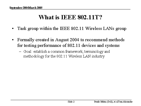 What is IEEE 802.11T? Task group within the IEEE 802.11 Wireless LANs group Formally created in August 2004 to recommend methods for testing performance of 802.11 devices and systems Goal: establish a common framework, terminology and methodology for the 802.11 Wireless LAN industry |