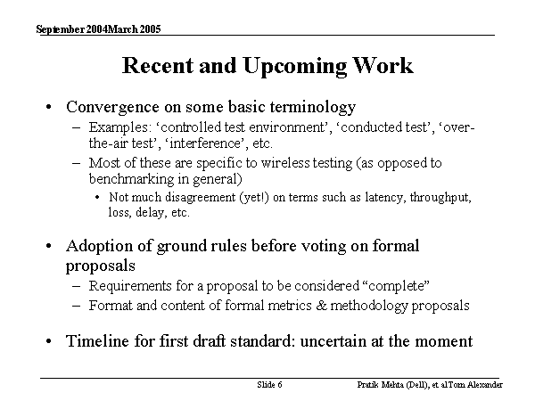 Recent and Upcoming Work Convergence on some basic terminology Examples: ‘controlled test environment’, ‘conducted test’, ‘over-the-air test’, ‘interference’, etc. Most of these are specific to wireless testing (as opposed to benchmarking in general) Not much disagreement (yet!) on terms such as latency, throughput, loss, delay, etc. Adoption of ground rules before voting on formal proposals Requirements for a proposal to be considered “complete” Format and content of formal metrics & methodology proposals Timeline for first draft standard: uncertain at the moment |