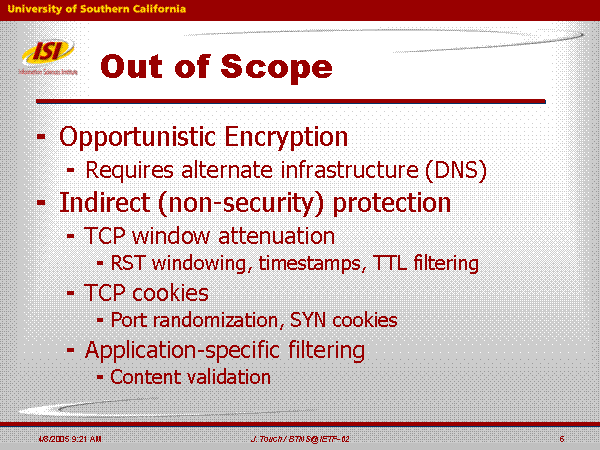 Out of Scope Opportunistic Encryption Requires alternate infrastructure (DNS) Indirect (non-security) protection TCP window attenuation RST windowing, timestamps, TTL filtering TCP cookies Port randomization, SYN cookies Application-specific filtering Content validation |