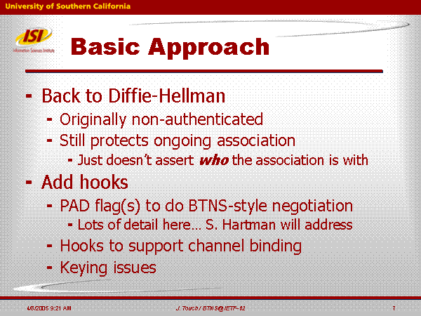 Basic Approach Back to Diffie-Hellman Originally non-authenticated Still protects ongoing association Just doesn’t assert who the association is with Add hooks PAD flag(s) to do BTNS-style negotiation Lots of detail here… S. Hartman will address Hooks to support channel binding Keying issues |