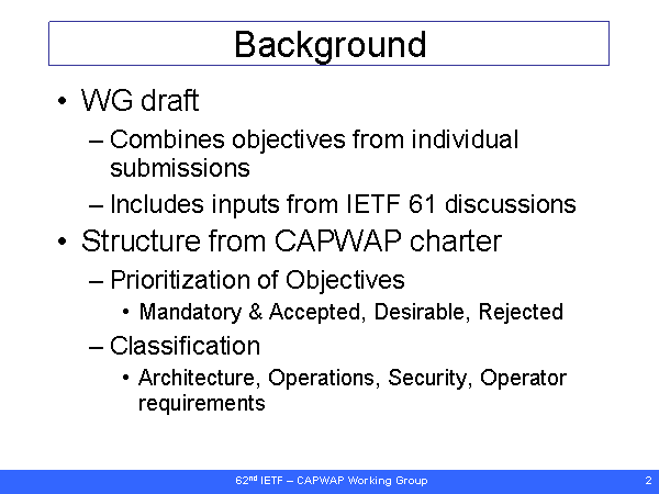 Background WG draft Combines objectives from individual submissions Includes inputs from IETF 61 discussions Structure from CAPWAP charter Prioritization of Objectives Mandatory & Accepted, Desirable, Rejected Classification Architecture, Operations, Security, Operator requirements |