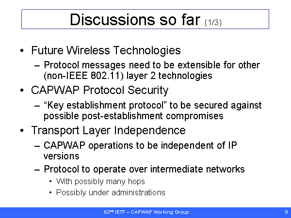 Discussions so far (1/3) Future Wireless Technologies Protocol messages need to be extensible for other (non-IEEE 802.11) layer 2 technologies CAPWAP Protocol Security “Key establishment protocol” to be secured against possible post-establishment compromises Transport Layer Independence CAPWAP operations to be independent of IP versions Protocol to operate over intermediate networks With possibly many hops Possibly under administrations |