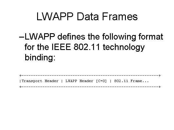 LWAPP Data Frames LWAPP defines the following format for the IEEE 802.11 technology binding: +-----------------------------------------------------------+ |Transport Header | LWAPP Header [C=0] | 802.11 Frame... +-----------------------------------------------------------+ |