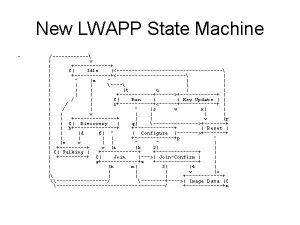New LWAPP State Machine /------------\ | v | +------------+ | C| Idle |<-----------------------------------\ | +------------+<-----------------------\ | | ^ |a ^ | | | | | \----\ | | | | | |t u | | | | | +-----------+------>+------------+ | | / | C| Run | | Key Update | | | / | r+-----------+<------+------------+ | | / | ^ |s w x| | | | v | | | | | | +--------------+ | | v |y | | C| Discovery | q| \--------------->+-------+ | | b+--------------+ +-------------+ | Reset | | | |d f| ^ | Configure |------->+-------+ | | | | | +-------------+p ^ | |e v | | ^ ^ | | +---------+ v |i |k 2| | | C| Sulking | +------------+ +--------------+ | | +---------+ C| Join |--->| Join-Confirm | | | g+------------+z +--------------+ | | |h m| 3| |4 | | | | | v |o |\ | | | +------------+ \\-----------------/ \--------+---->| Image Data |C \------------------------------------/ +------------+n |