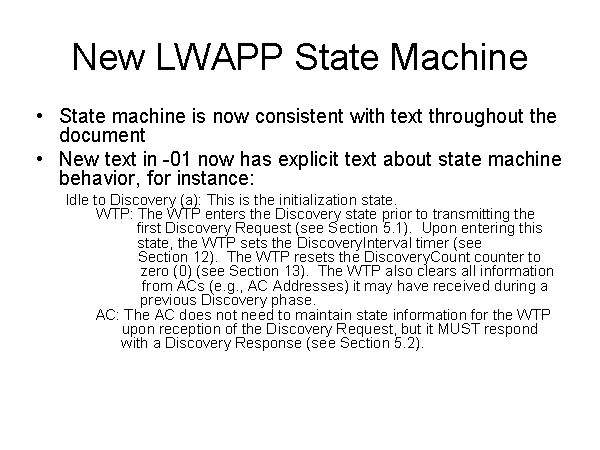 New LWAPP State Machine State machine is now consistent with text throughout the document New text in -01 now has explicit text about state machine behavior, for instance: Idle to Discovery (a): This is the initialization state. WTP: The WTP enters the Discovery state prior to transmitting the first Discovery Request (see Section 5.1). Upon entering this state, the WTP sets the DiscoveryInterval timer (see Section 12). The WTP resets the DiscoveryCount counter to zero (0) (see Section 13). The WTP also clears all information from ACs (e.g., AC Addresses) it may have received during a previous Discovery phase. AC: The AC does not need to maintain state information for the WTP upon reception of the Discovery Request, but it MUST respond with a Discovery Response (see Section 5.2). |