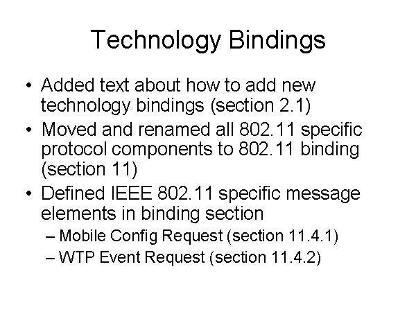 Technology Bindings Added text about how to add new technology bindings (section 2.1) Moved and renamed all 802.11 specific protocol components to 802.11 binding (section 11) Defined IEEE 802.11 specific message elements in binding section Mobile Config Request (section 11.4.1) WTP Event Request (section 11.4.2) |