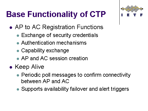 Base Functionality of CTP AP to AC Registration Functions Exchange of security credentials Authentication mechanisms Capability exchange AP and AC session creation Keep Alive Periodic poll messages to confirm connectivity between AP and AC Supports availability failover and alert triggers |