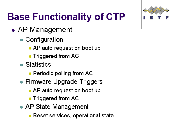 Base Functionality of CTP AP Management Configuration AP auto request on boot up Triggered from AC Statistics Periodic polling from AC Firmware Upgrade Triggers AP auto request on boot up Triggered from AC AP State Management Reset services, operational state |