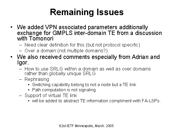 Remaining Issues We added VPN associated parameters additionally exchange for GMPLS inter-domain TE from a discussion with Tomonori Need clear definition for this (but not protocol specific) Over a domain (not multiple domains?) We also received comments especially from Adrian and Igor. How to use SRLG within a domain as well as over domains rather than globally unique SRLG Rephrasing Switching capability belong to not a node but a TE link Path computation is not signaling Support of virtual TE link will be added to abstract TE information compliment with FA-LSPs. |