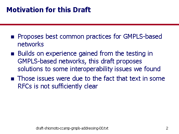 Motivation for this Draft Proposes best common practices for GMPLS-based networks Builds on experience gained from the testing in GMPLS-based networks, this draft proposes solutions to some interoperability issues we found Those issues were due to the fact that text in some RFCs is not sufficiently clear |