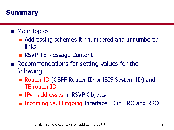 Summary Main topics Addressing schemes for numbered and unnumbered links RSVP-TE Message Content Recommendations for setting values for the following Router ID (OSPF Router ID or ISIS System ID) and TE router ID IPv4 addresses in RSVP Objects Incoming vs. Outgoing Interface ID in ERO and RRO |