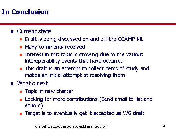 In Conclusion Current state Draft is being discussed on and off the CCAMP ML Many comments received Interest in this topic is growing due to the various interoperability events that have occurred This draft is an attempt to collect items of study and makes an initial attempt at resolving them What’s next Topic in new charter Looking for more contributions (Send email to list and editors) Target is to eventually get it accepted as WG draft |
