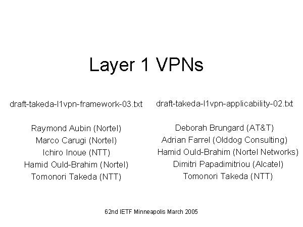 Layer 1 VPNs draft-takeda-l1vpn-framework-03.txt Raymond Aubin (Nortel) Marco Carugi (Nortel) Ichiro Inoue (NTT) Hamid Ould-Brahim (Nortel) Tomonori Takeda (NTT) draft-takeda-l1vpn-applicability-02.txt Deborah Brungard (AT&T) Adrian Farrel (Olddog Consulting) Hamid Ould-Brahim (Nortel Networks) Dimitri Papadimitriou (Alcatel) Tomonori Takeda (NTT) |