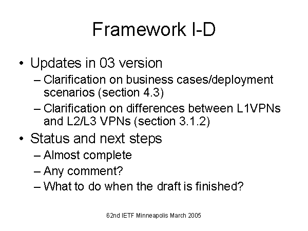 Framework I-D Updates in 03 version Clarification on business cases/deployment scenarios (section 4.3) Clarification on differences between L1VPNs and L2/L3 VPNs (section 3.1.2) Status and next steps Almost complete Any comment? What to do when the draft is finished? |