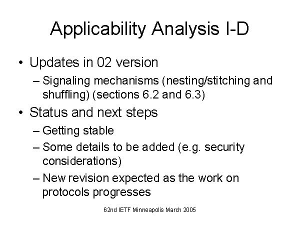 Applicability Analysis I-D Updates in 02 version Signaling mechanisms (nesting/stitching and shuffling) (sections 6.2 and 6.3) Status and next steps Getting stable Some details to be added (e.g. security considerations) New revision expected as the work on protocols progresses |