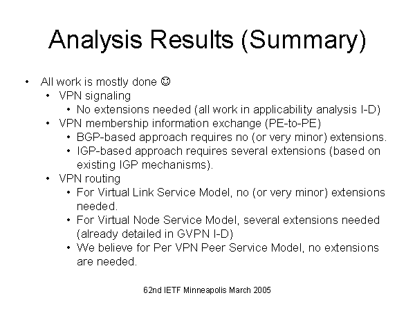 Analysis Results (Summary) All work is mostly done ? VPN signaling No extensions needed (all work in applicability analysis I-D) VPN membership information exchange (PE-to-PE) BGP-based approach requires no (or very minor) extensions. IGP-based approach requires several extensions (based on existing IGP mechanisms). VPN routing For Virtual Link Service Model, no (or very minor) extensions needed. For Virtual Node Service Model, several extensions needed (already detailed in GVPN I-D) We believe for Per VPN Peer Service Model, no extensions are needed. |