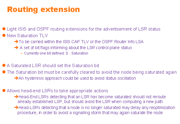 Routing extension Light ISIS and OSPF routing extensions for the advertisement of LSR status New Saturation TLV To be carried within the ISIS CAP TLV or the OSPF Router Info LSA A set of bit flags informing about the LSR control plane status Currently one bit defined: S : Saturation A Saturated LSR should set the Saturation bit The Saturation bit must be carefully cleared to avoid the node being saturated again An hysteresis approach could be used to avoid status oscillation Allows head-end LSRs to take appropriate actions Head-End LSRs detecting that an LSR has become saturated should not reroute already established LSP, but should avoid the LSR when computing a new path Head-LSRs detecting that a node is no longer saturated may delay any reoptimization procedure, in order to avoid a signalling storm that may again saturate the node |