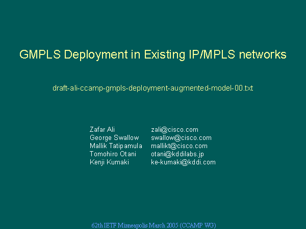 GMPLS Deployment in Existing IP/MPLS networksdraft-ali-ccamp-gmpls-deployment-augmented-model-00.txt Zafar Ali zali@cisco.com George Swallow swallow@cisco.com Mallik Tatipamula mallikt@cisco.com Tomohiro Otani otani@kddilabs.jp Kenji Kumaki ke-kumaki@kddi.com |