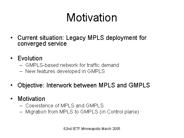 Motivation Current situation: Legacy MPLS deployment for converged service Evolution GMPLS-based network for traffic demand New features developed in GMPLS Objective: Interwork between MPLS and GMPLS Motivation Coexistence of MPLS and GMPLS Migration from MPLS to GMPLS (in Control plane) |