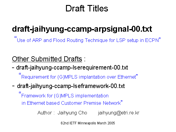 Draft Titlesdraft-jaihyung-ccamp-arpsignal-00.txt “Use of ARP and Flood Routing Technique for LSP setup in ECPN” Other Submitted Drafts :- draft-jaihyung-ccamp-lserequirement-00.txt “Requirement for (G)MPLS implantation over Ethernet”- draft-jaihyung-ccamp-lseframework-00.txt “Framework for (G)MPLS implementation in Ethernet based Customer Premise Network” Author : Jaihyung Cho jaihyung@etri.re.kr |
