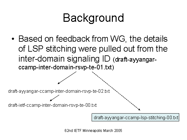 Background Based on feedback from WG, the details of LSP stitching were pulled out from the inter-domain signaling ID (draft-ayyangar-ccamp-inter-domain-rsvp-te-01.txt) draft-ietf-ccamp-inter-domain-rsvp-te-00.txt draft-ayyangar-ccamp-lsp-stitching-00.txt draft-ayyangar-ccamp-inter-domain-rsvp-te-02.txt |