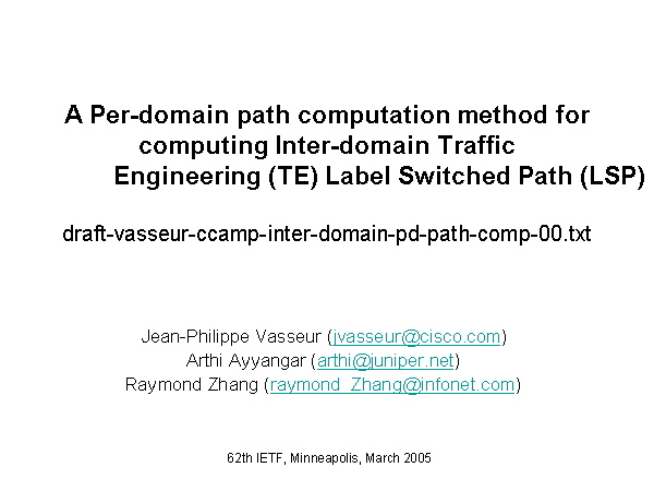 A Per-domain path computation method for computing Inter-domain Traffic Engineering (TE) Label Switched Path (LSP) draft-vasseur-ccamp-inter-domain-pd-path-comp-00.txt Jean-Philippe Vasseur (jvasseur@cisco.com) Arthi Ayyangar (arthi@juniper.net) Raymond Zhang (raymond_Zhang@infonet.com) |