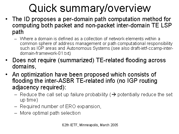 Quick summary/overview The ID proposes a per-domain path computation method for computing both packet and non-packet inter-domain TE LSP path Where a domain is defined as a collection of network elements within a common sphere of address management or path computational responsibility such as IGP areas and Autonomous Systems (see also draft-ietf-ccamp-inter-domain-framework-01.txt) Does not require (summarized) TE-related flooding across domains, An optimization have been proposed which consists of flooding the inter-ASBR TE-related info (no IGP routing adjacency required): Reduce the call set up failure probability (? potentially reduce the set up time) Required number of ERO expansion, More optimal path selection |
