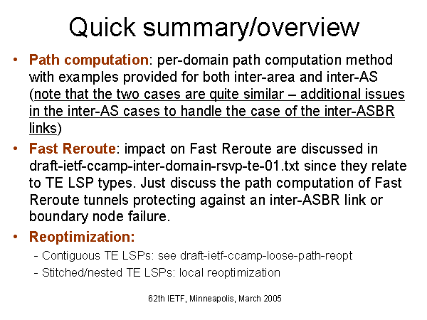 Quick summary/overview Path computation: per-domain path computation method with examples provided for both inter-area and inter-AS (note that the two cases are quite similar – additional issues in the inter-AS cases to handle the case of the inter-ASBR links) Fast Reroute: impact on Fast Reroute are discussed in draft-ietf-ccamp-inter-domain-rsvp-te-01.txt since they relate to TE LSP types. Just discuss the path computation of Fast Reroute tunnels protecting against an inter-ASBR link or boundary node failure. Reoptimization: - Contiguous TE LSPs: see draft-ietf-ccamp-loose-path-reopt - Stitched/nested TE LSPs: local reoptimization |
