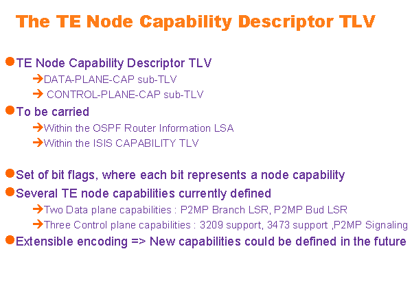 The TE Node Capability Descriptor TLV TE Node Capability Descriptor TLV DATA-PLANE-CAP sub-TLV CONTROL-PLANE-CAP sub-TLV To be carried Within the OSPF Router Information LSA Within the ISIS CAPABILITY TLV Set of bit flags, where each bit represents a node capability Several TE node capabilities currently defined Two Data plane capabilities : P2MP Branch LSR, P2MP Bud LSR Three Control plane capabilities : 3209 support, 3473 support ,P2MP Signaling Extensible encoding => New capabilities could be defined in the future |