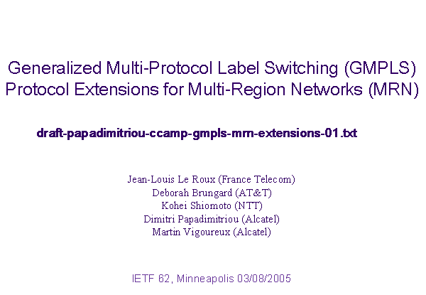 Generalized Multi-Protocol Label Switching (GMPLS) Protocol Extensions for Multi-Region Networks (MRN) draft-papadimitriou-ccamp-gmpls-mrn-extensions-01.txt Jean-Louis Le Roux (France Telecom) Deborah Brungard (AT&T) Kohei Shiomoto (NTT) Dimitri Papadimitriou (Alcatel)Martin Vigoureux (Alcatel) IETF 62, Minneapolis 03/08/2005 |