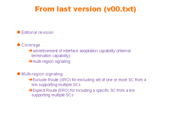 From last version (v00.txt) Editorial revision Coverage advertisement of interface adaptation capability (internal termination capability) multi-region signaling Multi-region signaling Exclude Route (XRO) for excluding set of one or more SC from a link supporting multiple SCs Explicit Route (ERO) for including a specific SC from a link supporting multiple SCs |
