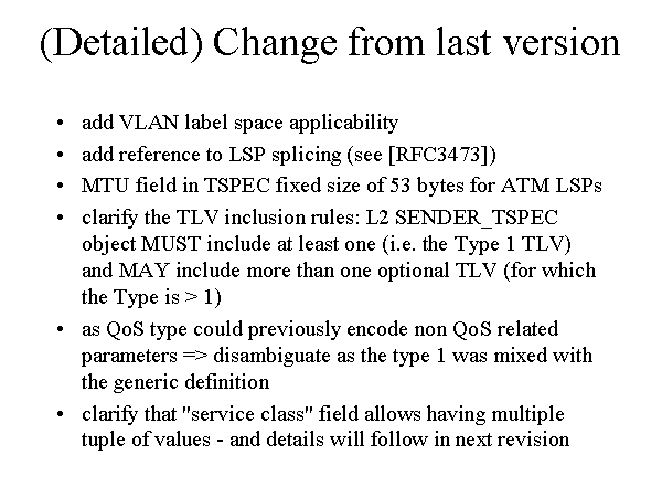 (Detailed) Change from last version add VLAN label space applicability add reference to LSP splicing (see [RFC3473]) MTU field in TSPEC fixed size of 53 bytes for ATM LSPs clarify the TLV inclusion rules: L2 SENDER_TSPEC object MUST include at least one (i.e. the Type 1 TLV) and MAY include more than one optional TLV (for which the Type is > 1) as QoS type could previously encode non QoS related parameters => disambiguate as the type 1 was mixed with the generic definition clarify that "service class" field allows having multiple tuple of values - and details will follow in next revision |