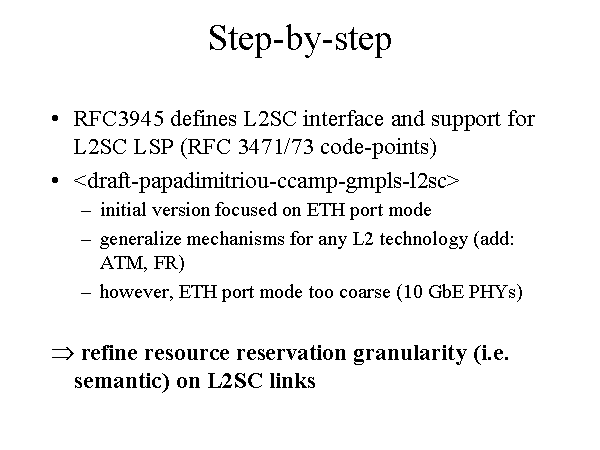 Step-by-step RFC3945 defines L2SC interface and support for L2SC LSP (RFC 3471/73 code-points) initial version focused on ETH port mode generalize mechanisms for any L2 technology (add: ATM, FR) however, ETH port mode too coarse (10 GbE PHYs) ? refine resource reservation granularity (i.e. semantic) on L2SC links |