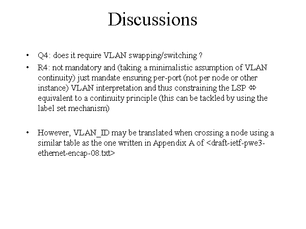Discussions Q4: does it require VLAN swapping/switching ? R4: not mandatory and (taking a minimalistic assumption of VLAN continuity) just mandate ensuring per-port (not per node or other instance) VLAN interpretation and thus constraining the LSP ? equivalent to a continuity principle (this can be tackled by using the label set mechanism) However, VLAN_ID may be translated when crossing a node using a similar table as the one written in Appendix A of |