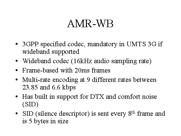 AMR-WB 3GPP specified codec, mandatory in UMTS 3G if wideband supported Wideband codec (16kHz audio sampling rate) Frame-based with 20ms frames Multi-rate encoding at 9 different rates between 23.85 and 6.6 kbps Has built in support for DTX and comfort noise (SID) SID (silence descriptor) is sent every 8th frame and is 5 bytes in size |