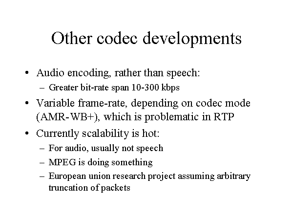 Other codec developments Audio encoding, rather than speech: Greater bit-rate span 10-300 kbps Variable frame-rate, depending on codec mode (AMR-WB+), which is problematic in RTP Currently scalability is hot: For audio, usually not speech MPEG is doing something European union research project assuming arbitrary truncation of packets |